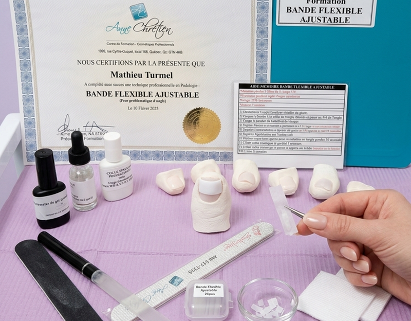 La bande flexible ajustable est une technique révolutionnaire utilisant des lamelles de fibre de verre. Elle permet de corriger la courbure de l'ongle (ongles en volute) et de libérer les sillons de façon non invasive. C'est un soin incontournable pour les clients souffrant de douleurs chroniques ou de déformations héréditaires.